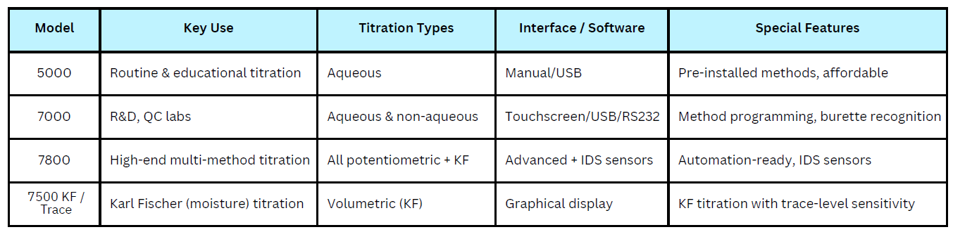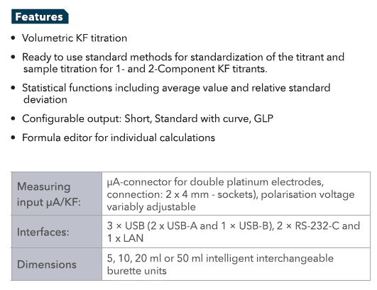 The TitroLine® 7500 KF is a specialized volumetric Karl Fischer titrator designed for accurate and reliable water content determination across a wide range of sample types. Built for laboratories where moisture analysis is essential, the 7500 KF delivers fast, precise, and reproducible results with minimal operator effort. Its intuitive interface and intelligent reagent handling make it ideal for routine and regulated environments.